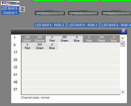 Ok I've attached the screen dump. Channels 1 (effect/gobo) and 2 (dimmer) are the controls and channels 3 through 11 are the RGB sliders. The RGB sliders work perfectly however with the current values that are being displayed (255), the lights should be sound strobing and instead they are just doing a fast chase.