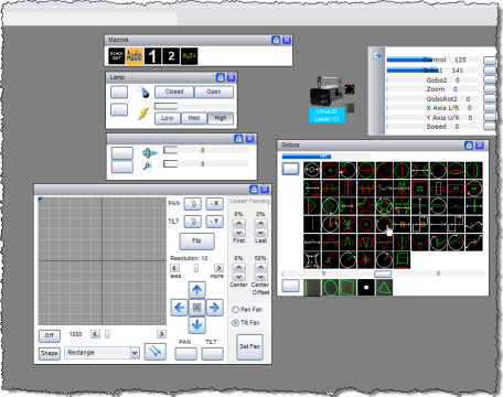 The problem with lasers is they fall into a class of there own in as much as most DMX controllers have no idea about how to control them as they do not have the "standard" range of funtions, such as pan/tilt, colour wheels etc. Sometimes you can use the gobo wheel function for any preset patterns a lase might have on a channel, but normally this is not the case as a lot of them use to channels for pattern selection i.e. they have n number of patterns in 1 channel (say 32 patterns) and then in 2nd channel they have n number of banks of patterns (say 8). This in someways makes it easier to select the pattern you want by the slider method but does not lend itself to being controlled easily via "standard" PC DMX controllers. You could for example say it has 2 gobo wheels and say the first has 32 gobos and the second has 8 gobos and then could select the pattern/group you want from those 2 controls.