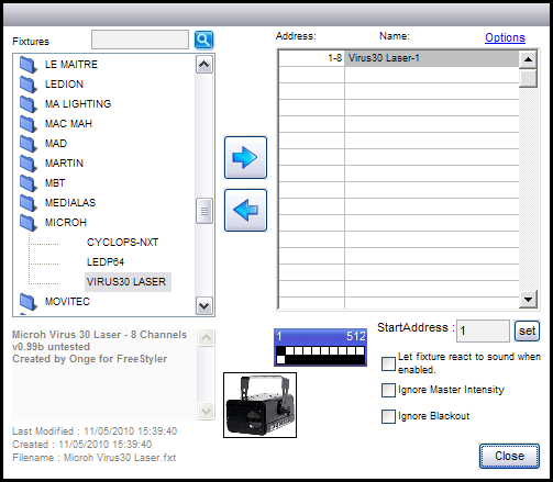 Start a new show in FreeStyler and add one of these fixtures, you will see the address as 1. See the adding and removing fixtures in FreeStyler tutorial on the FreeStyler wiki for more information.