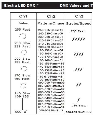 8. strobe ch = 3 off = 0 low = 63 med = 126 high = 255 (you may need to play with these to get the desired speeds)