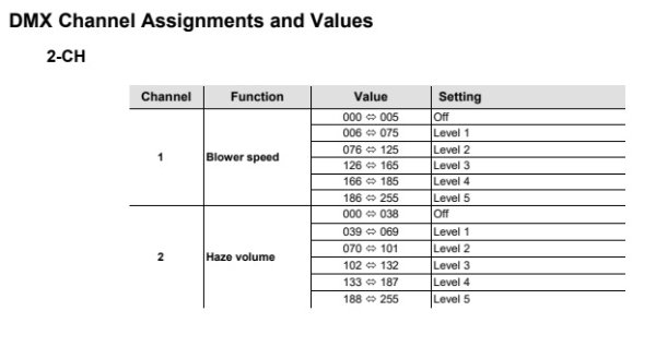 It seems easy enough: 2 DMX channels, output and fan speed. If no one has one, I'll post mine when I get it working.