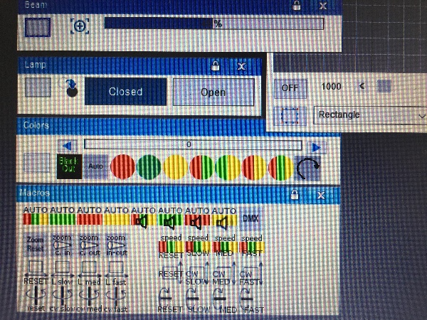 Lamp:Open/Closed makes no difference. The On/Off on the Shape Maker does not change things. BlackOut on Colors does not help. The only thing I have found to work is the first button in Macros, the AUTO with RGY as the icon - this will make the laser appear or disappear, but I don't think this is meant to be an On/Off button and I'm worried that I might damage my laser if it is used to shut off the beam. Even when I do use this to shut it off, the laser will still come alive in chases where I had set it to disappear using that button.